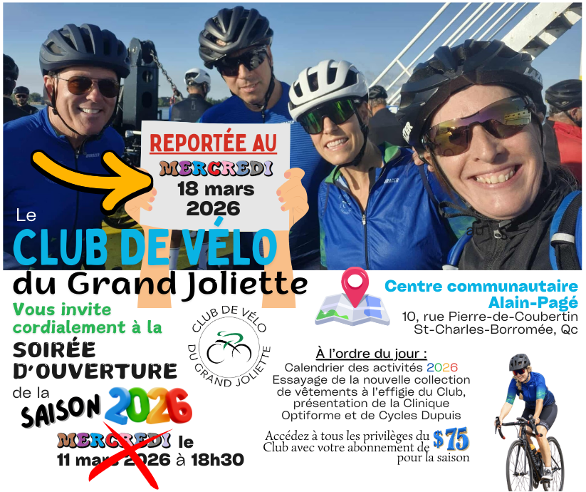 Pour renforcer l'esprit d'équipe, la fierté d'appartenance et notre visibilité sur les routes, nous vous encourageons fortement (sans obligation, bien sûr!) à porter fièrement le maillot officiel du Club lors de toutes nos sorties spéciales, ainsi que pendant les sorties régulières du dimanche.